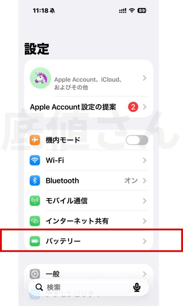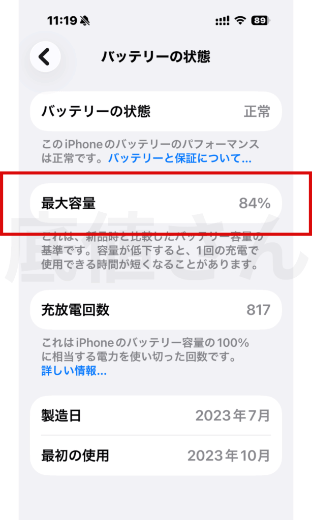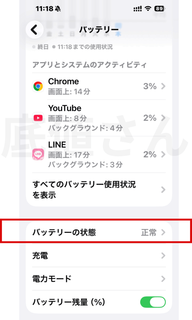 確認手順:「設定」→「バッテリー」→「バッテリーの状態」